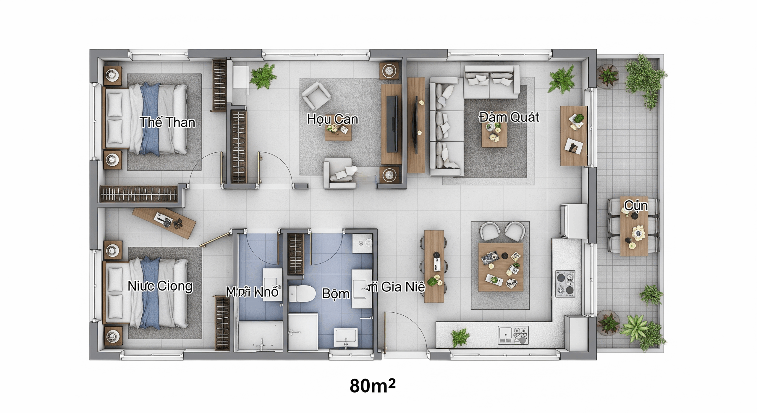 Diện tích 80m2 được coi là “con số vàng” cho các gia đình có 3-4 thành viên. Đây là kích thước đủ lớn để bố trí đầy đủ các khu vực chức năng mà vẫn đảm bảo tính thẩm mỹ và chi phí xây dựng hợp lý.